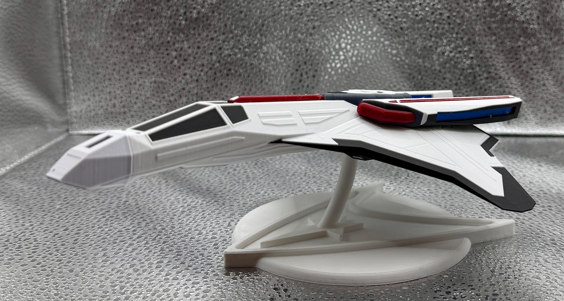 Vibrant Accents: The white hull is broken up by sleek red striping along the spine and wings, giving it an undeniable "hot rod" interceptor aesthetic.