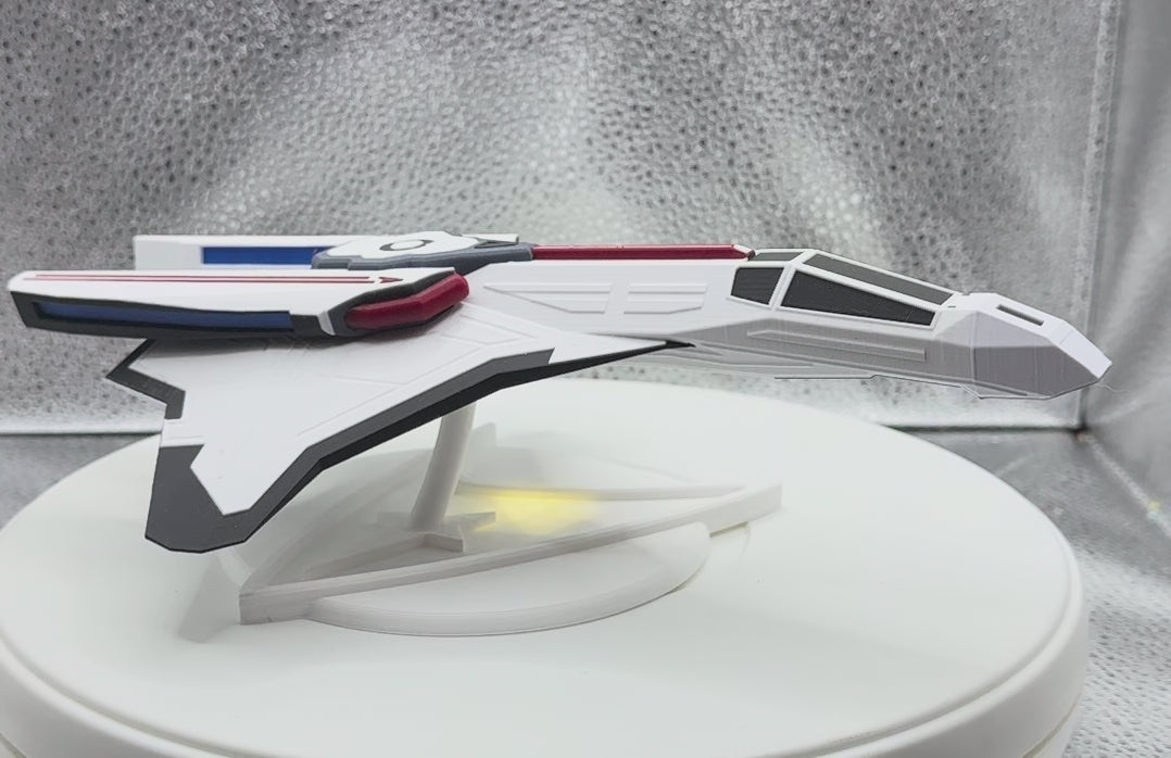 Bring some close-air support to your starship collection with this stunning replica of the Gryphon-Class Fighter. Designed for high-speed intercepts, dogfighting, and tactical strikes, this ship trades the bulky saucer section of a standard starship for a purely aerodynamic, predatory profile.