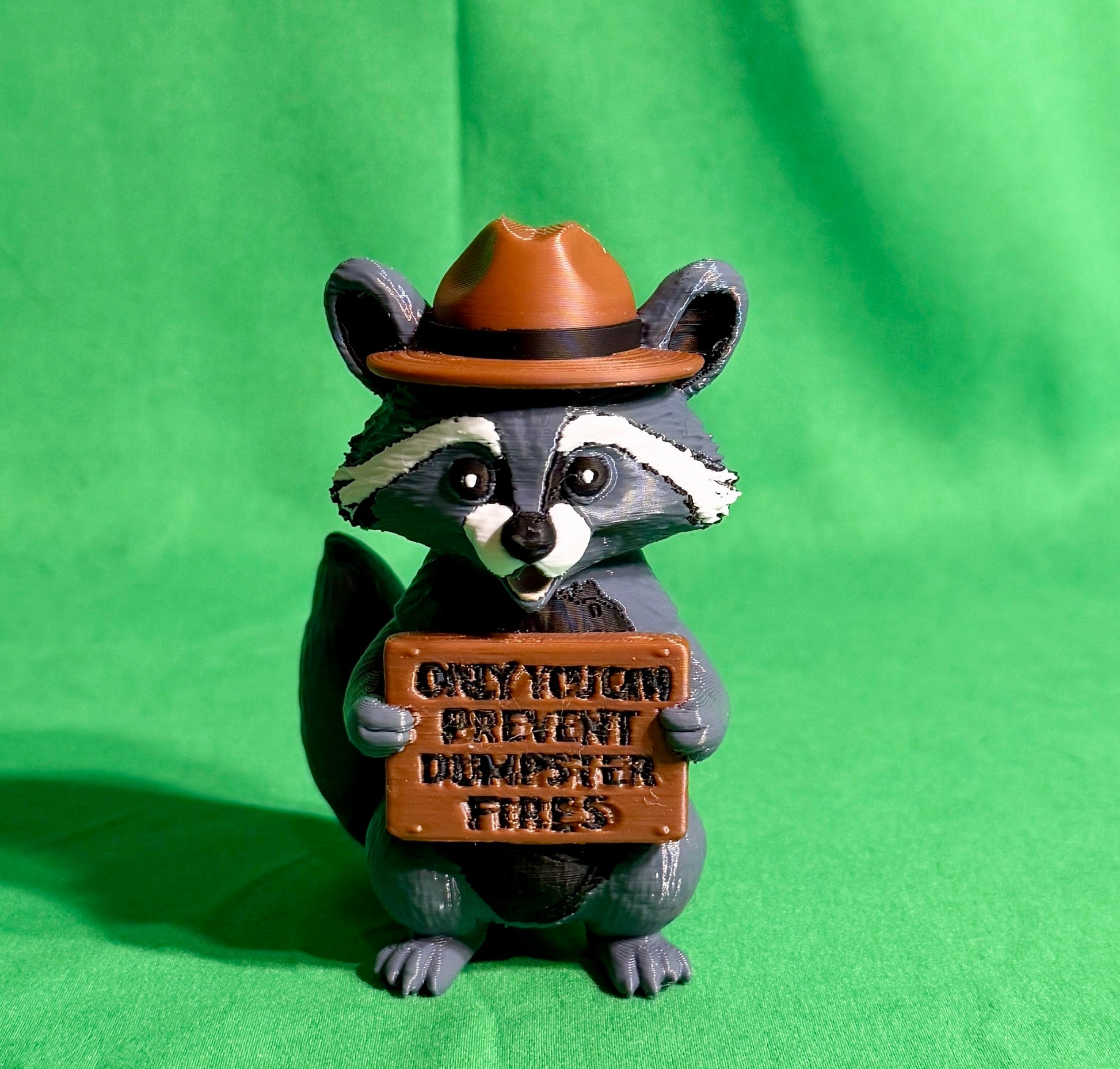 The Vibe: He’s cute, he’s textured, and he’s tired of your mess. He holds a sign with the solid advice: "ONLY YOU CAN PREVENT DUMPSTER FIRES".