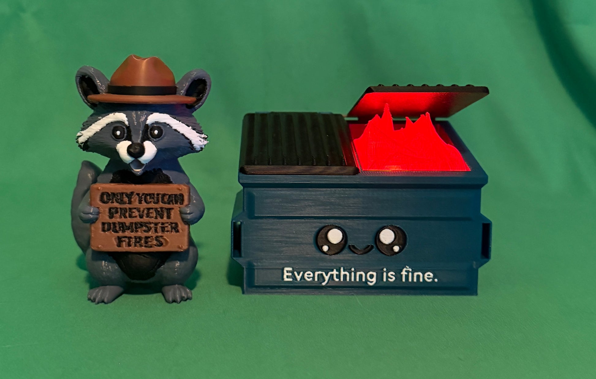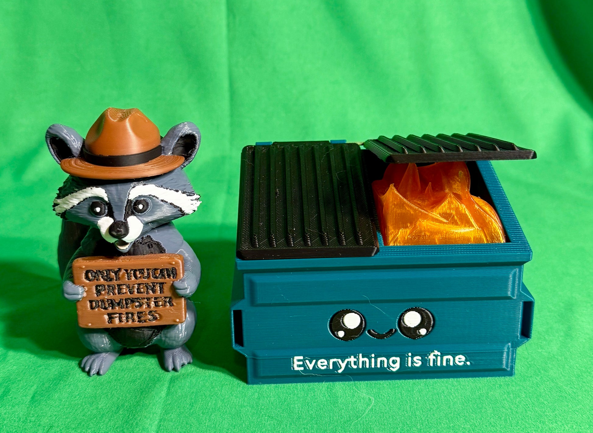 You can grab the "Everything is Fine" Dumpster to light up your desk, the cynical "Ranger Raccoon" to warn your coworkers, or get the Full Set for maximum safety.